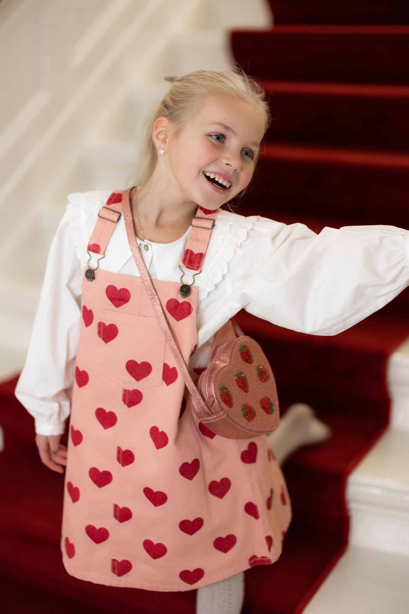 Hoe leuk is deze jurk? Gemaakt van zacht denim, met stoere gespen en bandjes én met glitter hartjes over de hele stof. Perfect voor een vrolijke en trendy look!