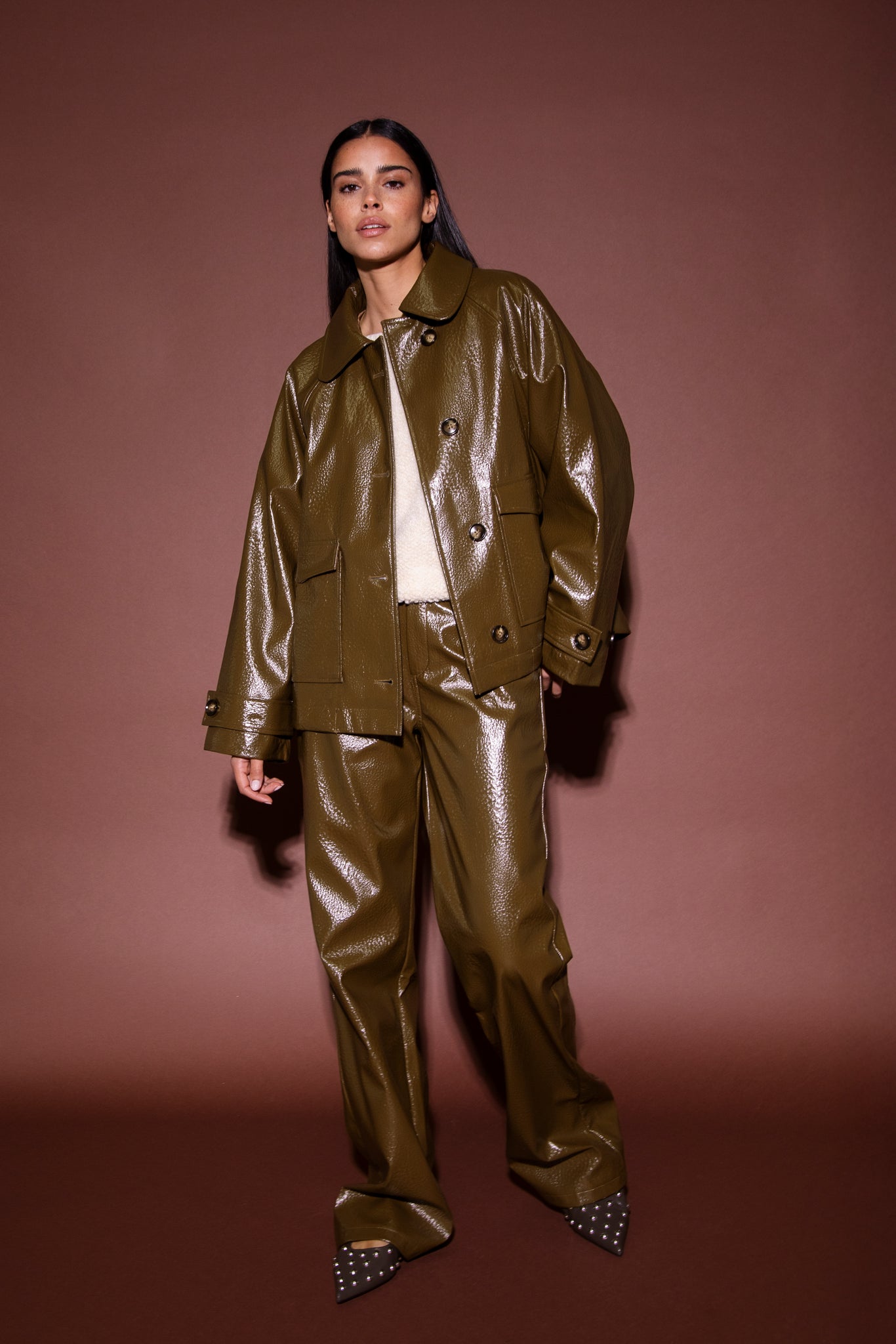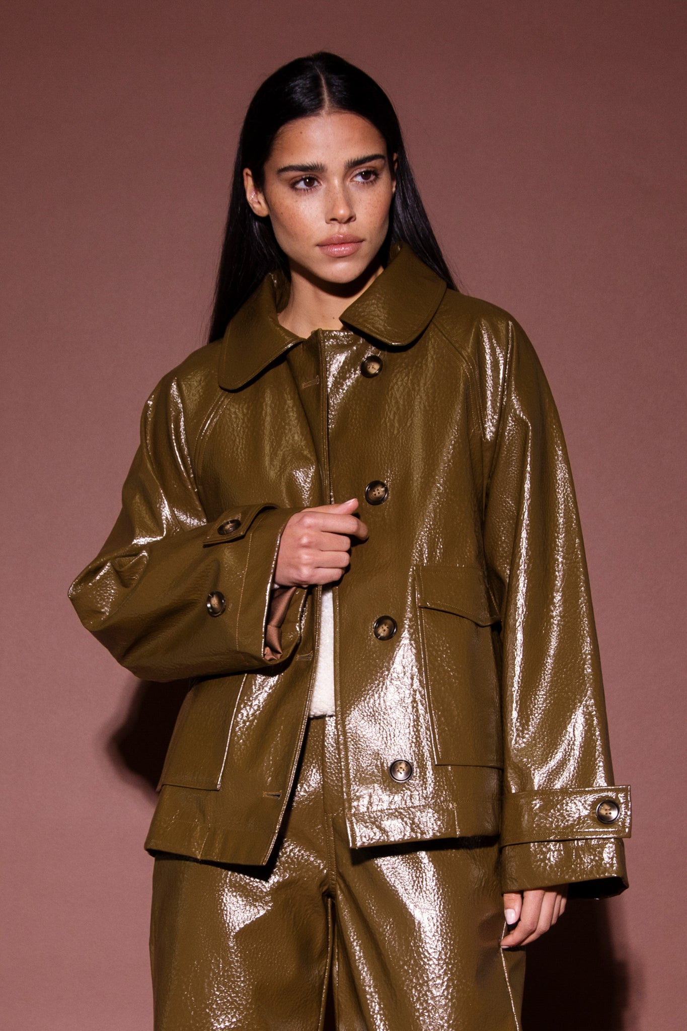 Donkergroen leren jas met kraag en zakken