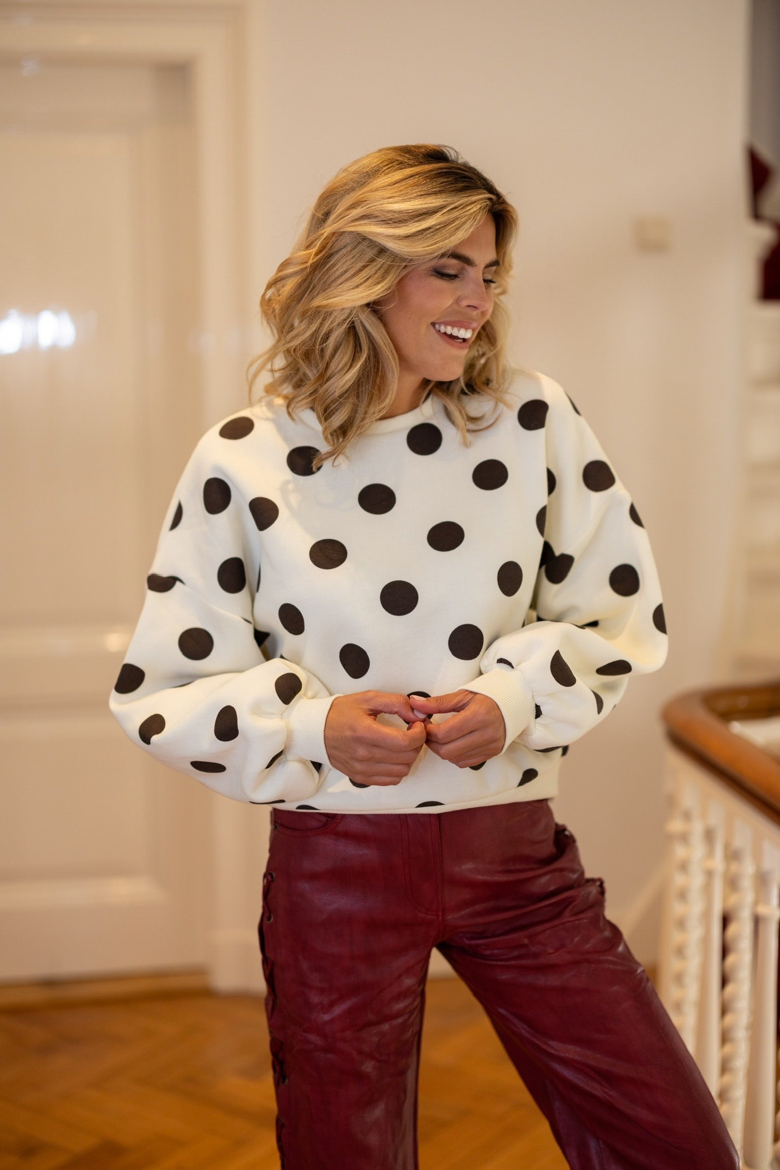 Deze lekkere sweat heeft trendy stippen en heeft een fijne fit die ieder lijf op de juiste plek accentueert! Combineer de trui met pants Praliné of een stoere jeans. De trui valt op de broek, wil je de trui graag wat langer dragen? Kies dan voor een maatje groter!