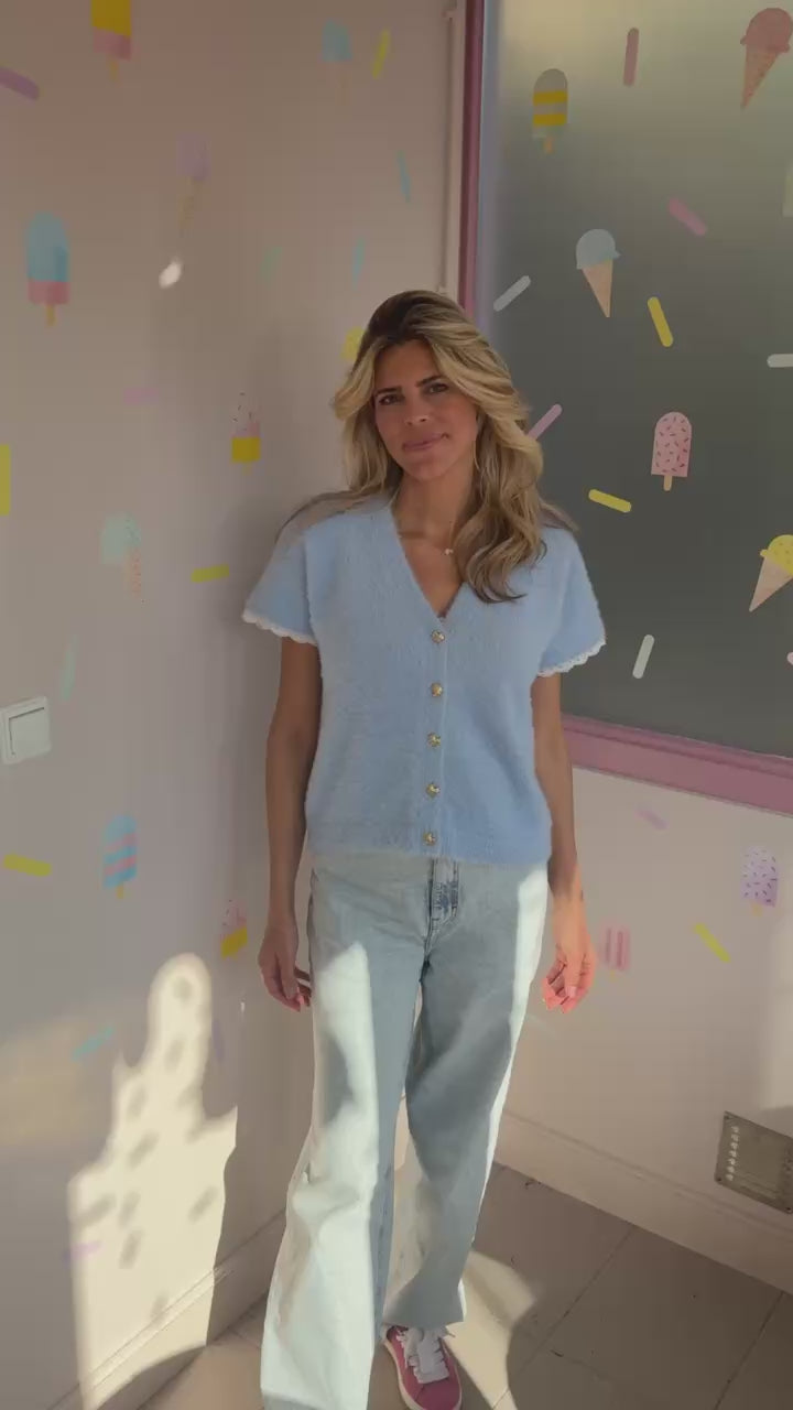 🩷 Lichtblauw dames vestje met kanten randje, gouden knopen en korte mouwen