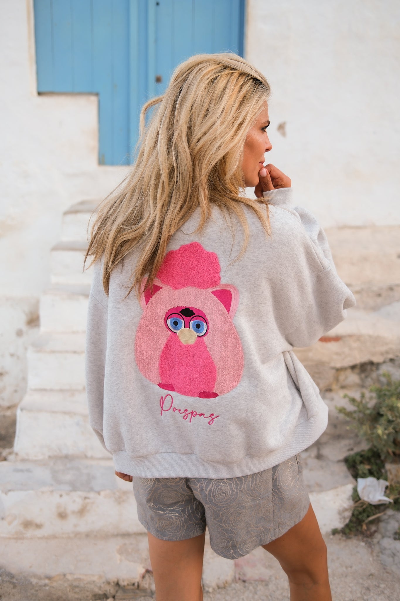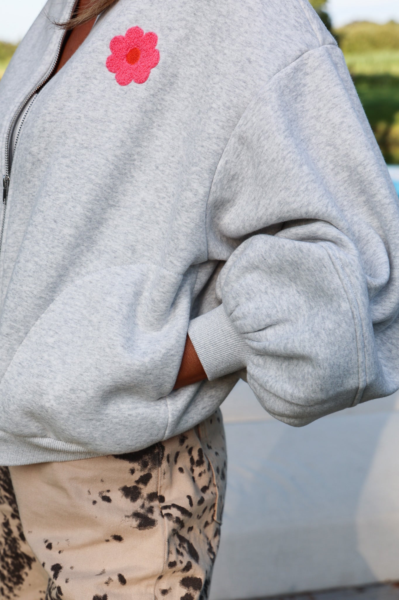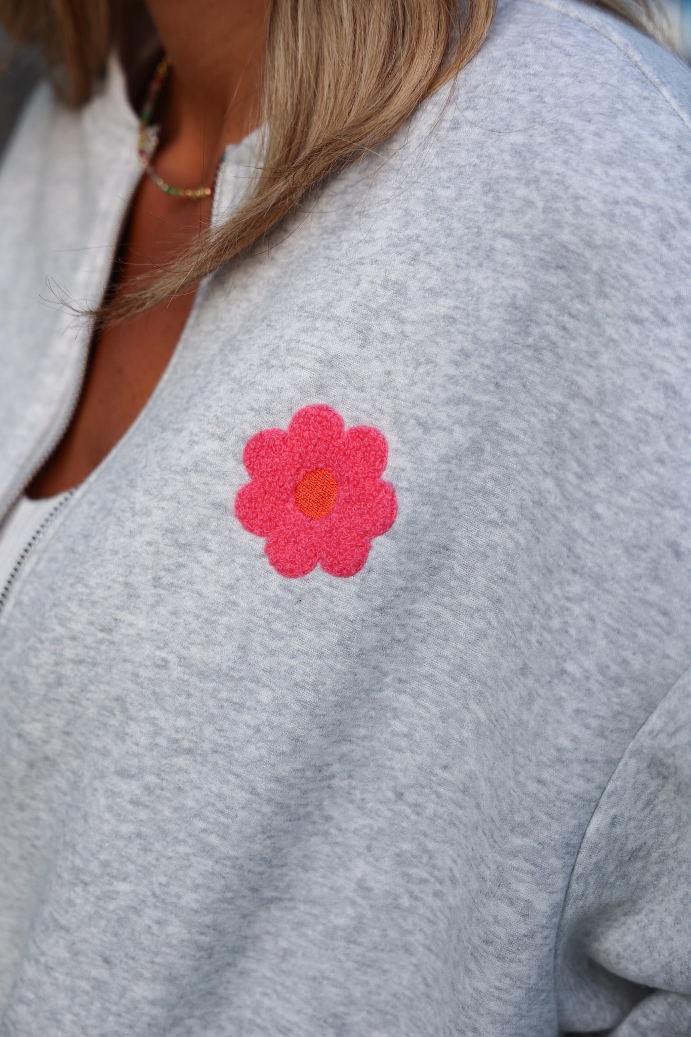 Grijs sweatvest met ritssluiting en grote illustratie op de achterzijde