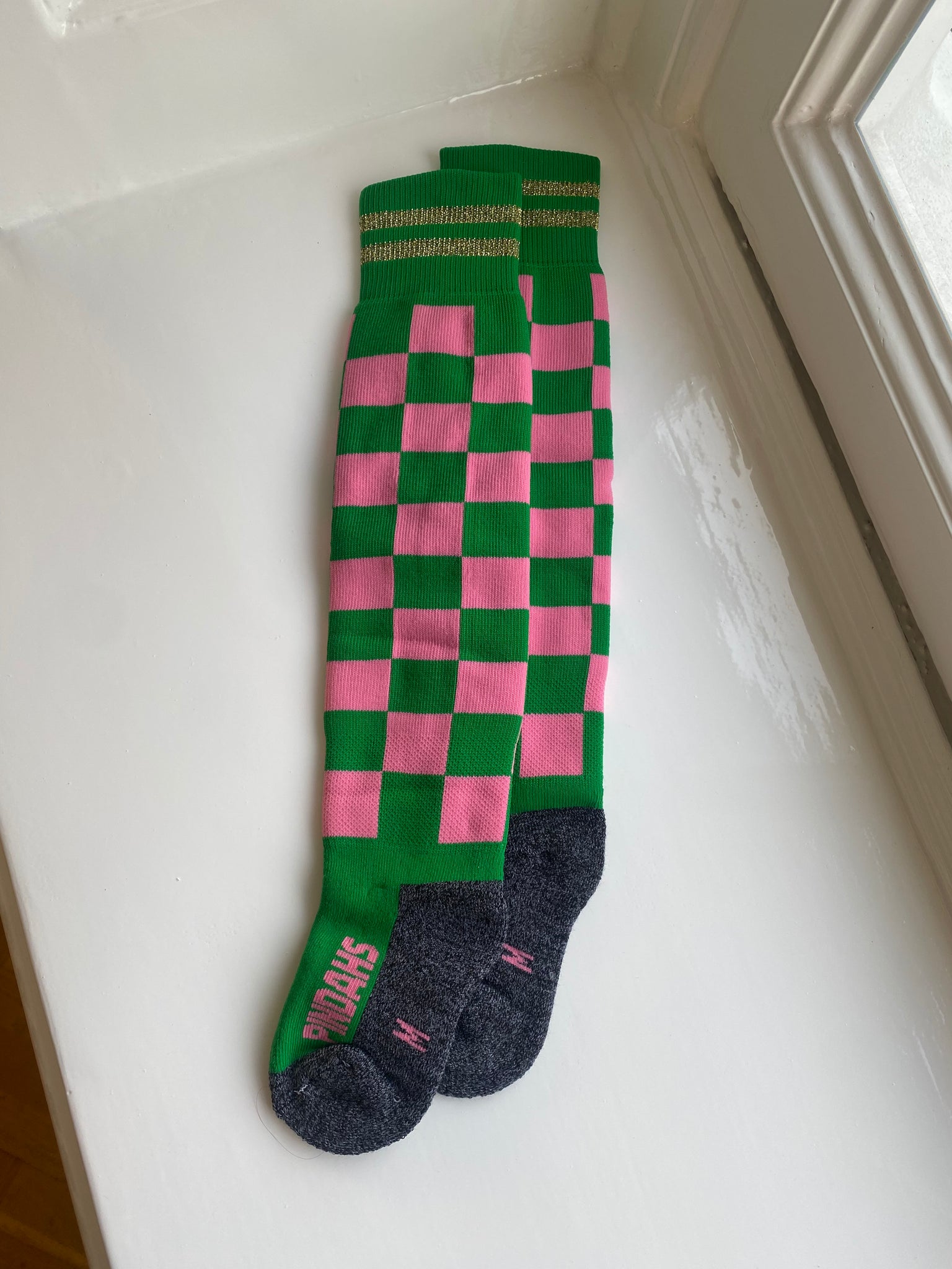 Hockeysokken met ruitjesprint in roze en groen met gouden randjes