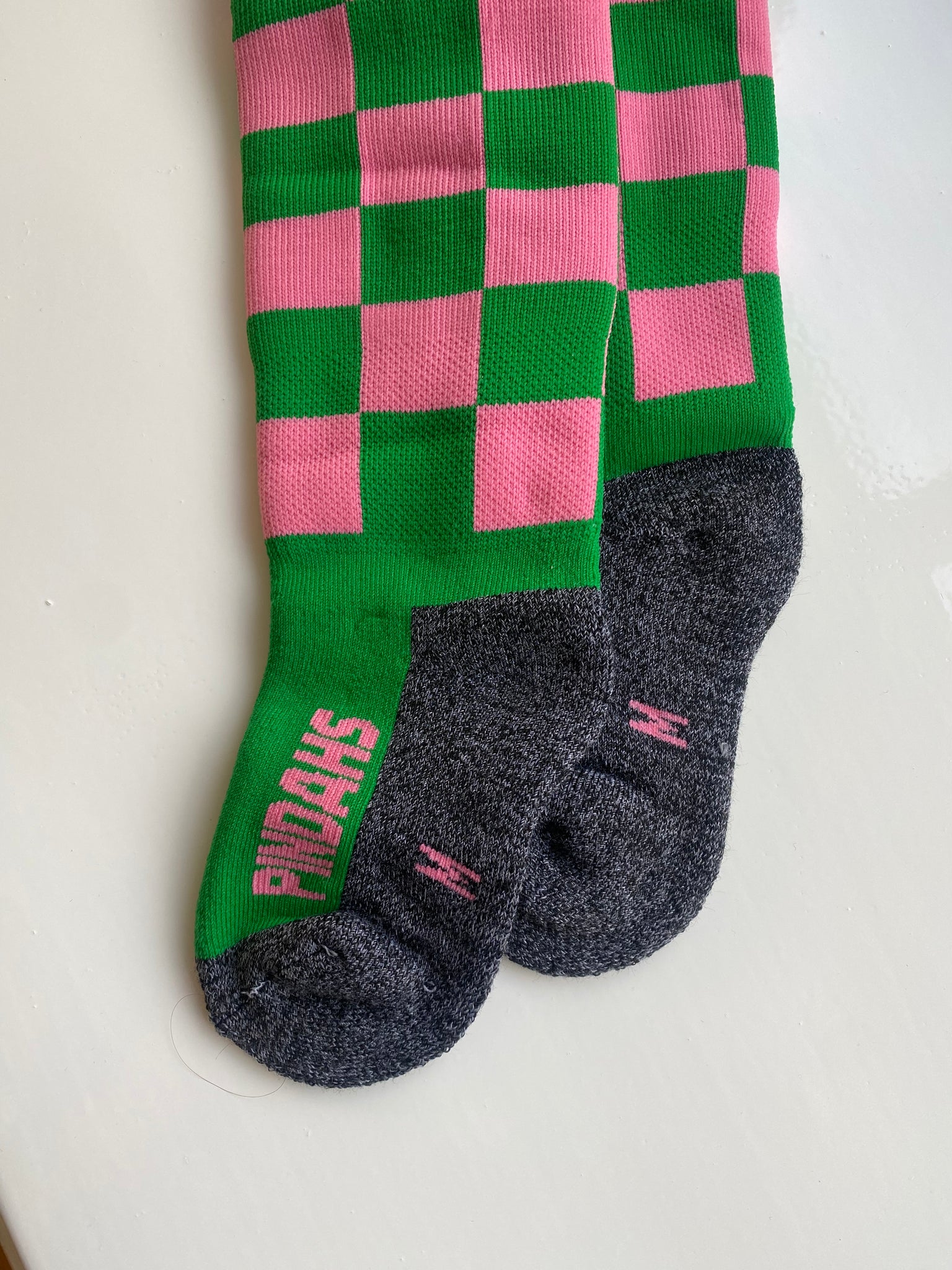 These cool hockey socks have a fun checked print in fresh pink and green with shiny gold edges at the top.