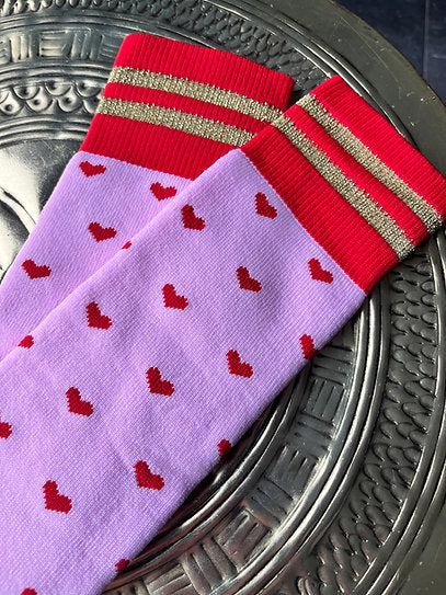 Hoge roze sokken met rode hartjes en glitter randjes