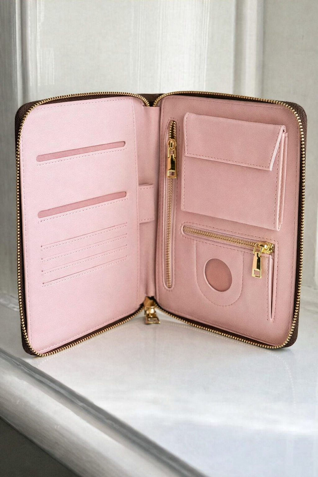 🩷 2 vakken voor paspoorten/identiteitskaarten (een derde paspoort/identiteitskaart past in het bewaarvak erachter)